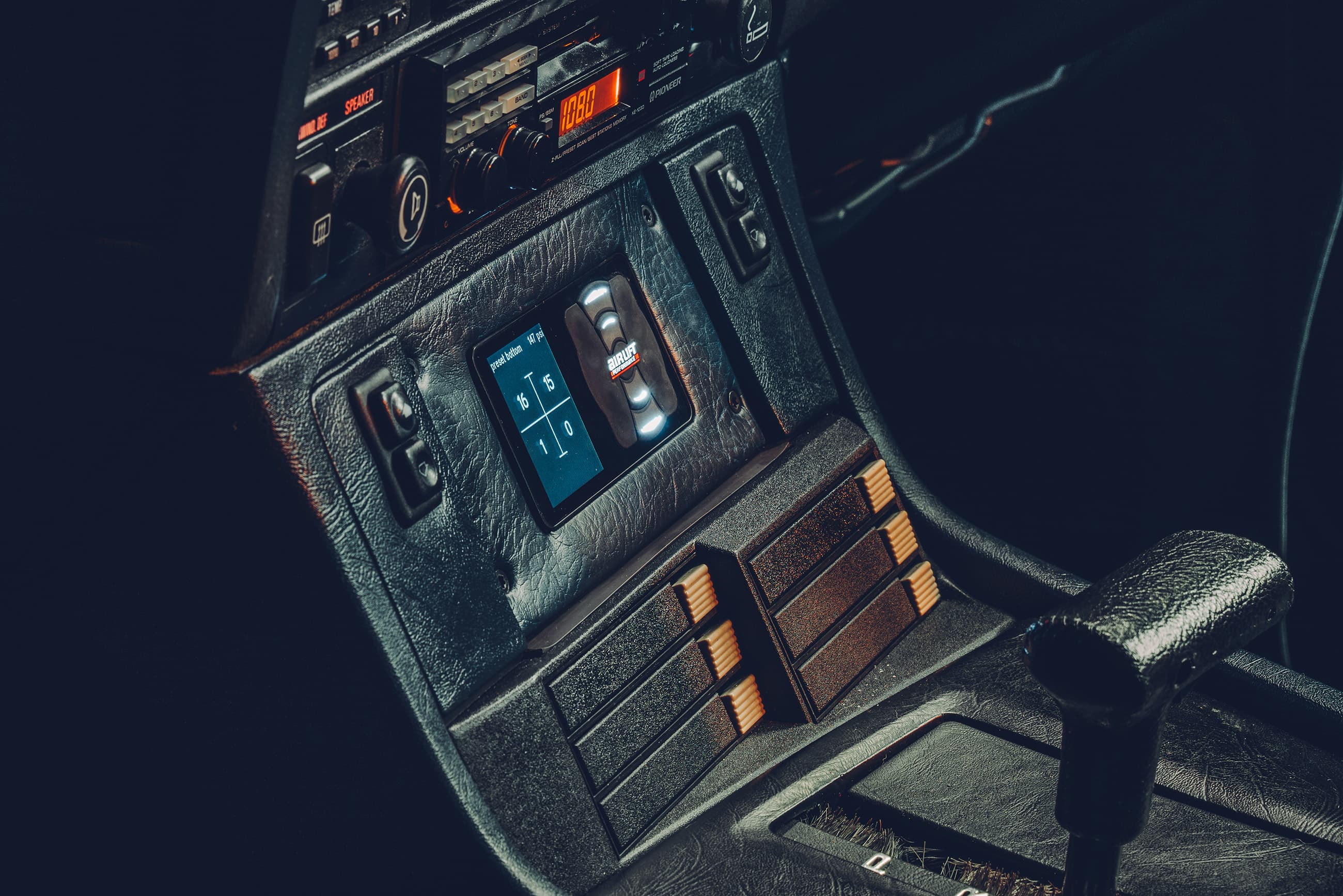 Our favorite part has to be the 3D printed centre console which perfectly incorporates the Air Lift Performance 3P controller. Where do you even find a 3D printer capable of doing that?!